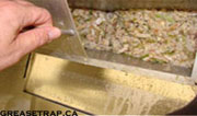 Effluent or dishwater enters the Goslyn Grease Recovery Device. Food particles are collected in the food solids strainer basket.